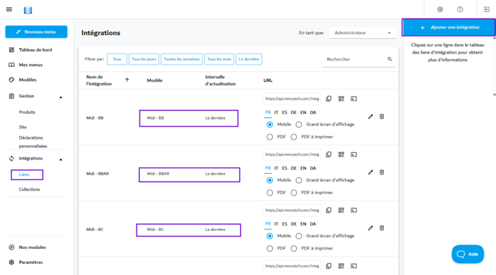 Les liens d'intégration permettent à vos menus d'être mis à jour automatiquement à des intervalles de temps personnalisés. Suivez les étapes suivantes pour créer des liens d'intégration :
