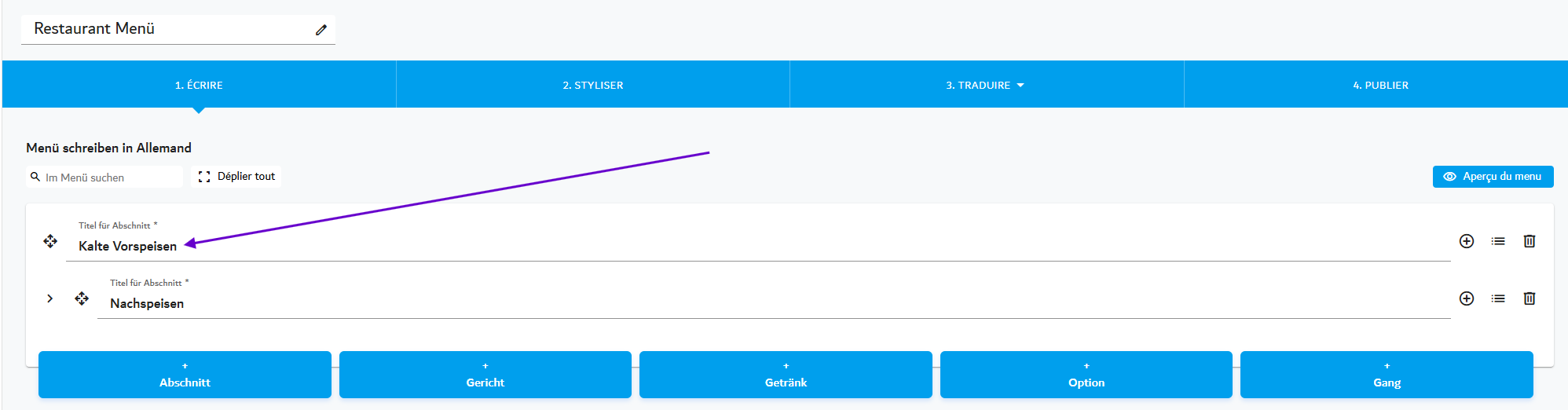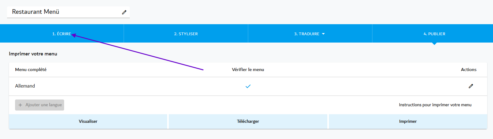 Depuis votre tableau de bord, naviguez vers l'écran "Écrire". C'est ici que vous pouvez modifier le contenu de votre menu.