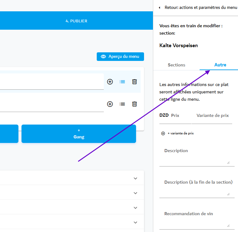 Dans la section sélectionnée, naviguez vers l'onglet "Autres". Cet onglet contient des options supplémentaires pour personnaliser votre section.
