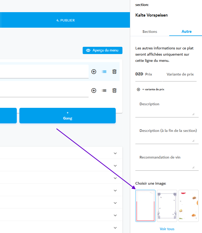 Sélectionnez la section du menu à laquelle vous souhaitez ajouter une image d'arrière-plan. Vous pouvez choisir n'importe quelle section que vous souhaitez personnaliser.