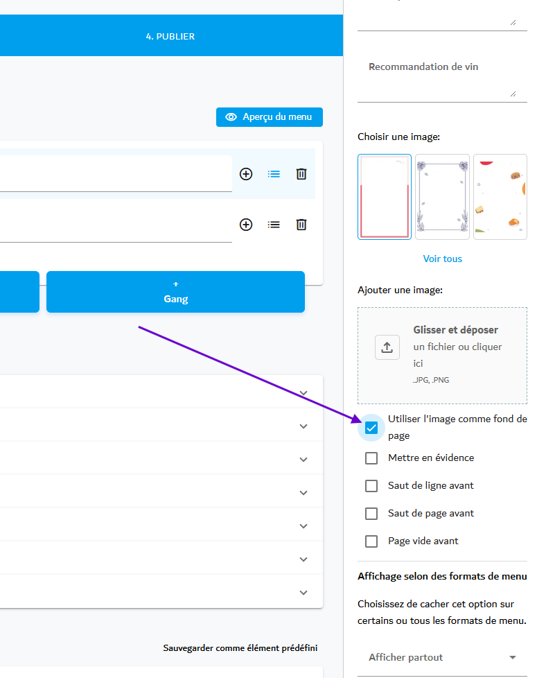 La fonction "Utiliser comme arrière-plan de page" de Menutech vous permet de personnaliser votre menu en utilisant n'importe quelle image comme arrière-plan de vos pages de menu. Ce guide vous explique les étapes à suivre pour utiliser cette fonction, afin de créer des menus visuellement attrayants qui reflètent le style unique de votre marque