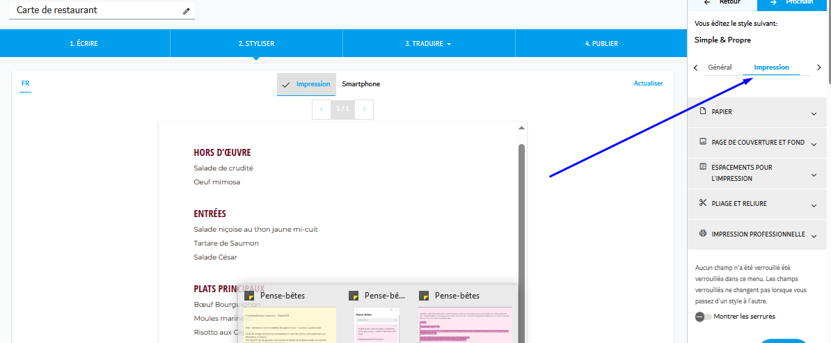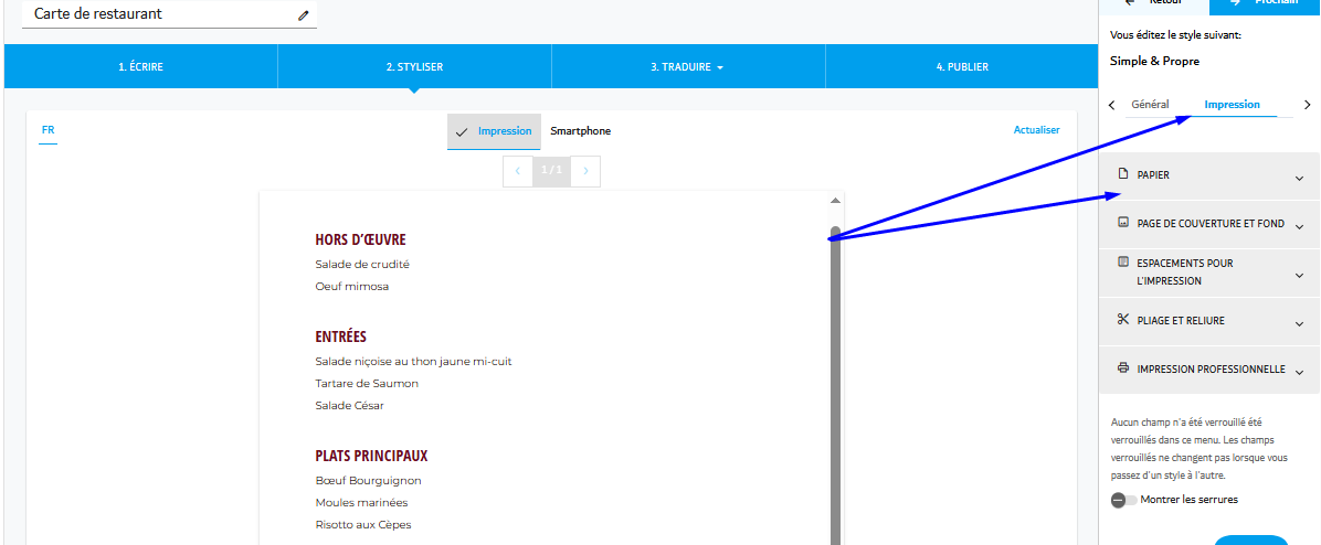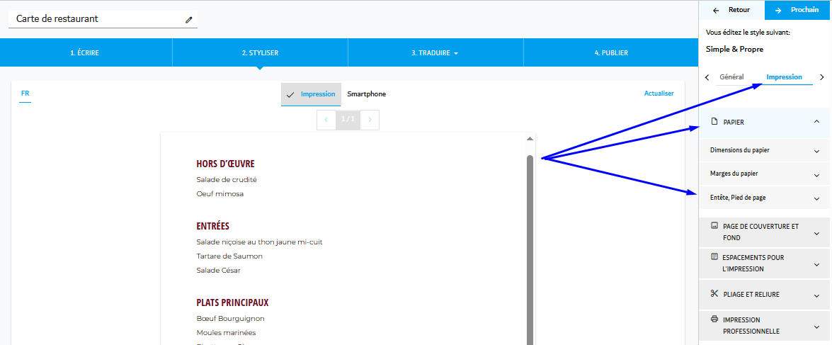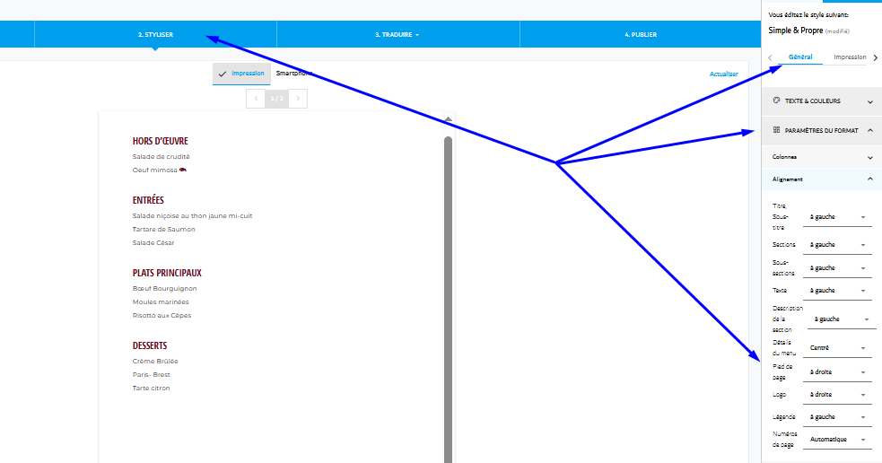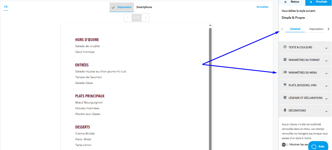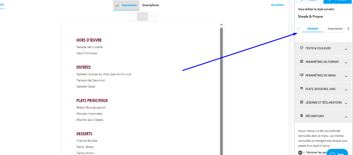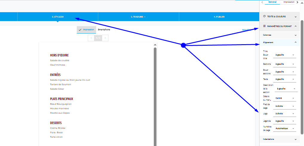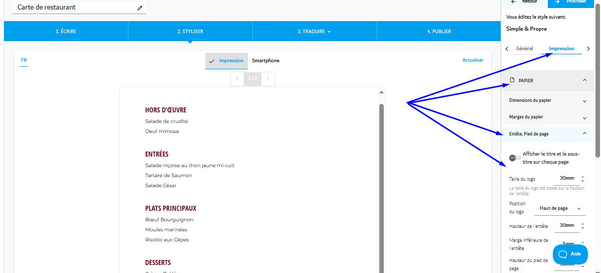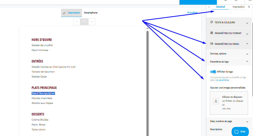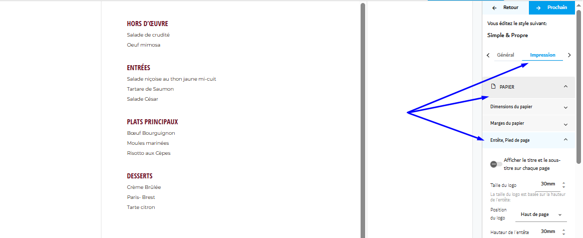 Menutech offre des outils puissants pour vous aider à personnaliser l'apparence de votre menu, vous permettant de donner vie même aux idées les plus créatives. Ce guide vous accompagnera dans l'ajustement des paramètres d'en-tête, de pied de page et de logo de votre menu, garantissant une mise en page professionnelle et visuellement attrayante.