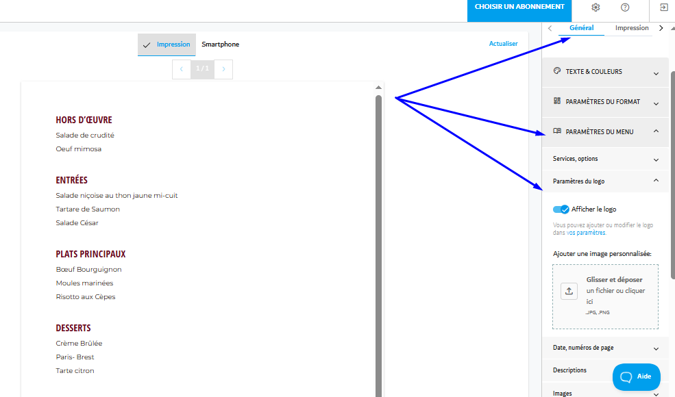 Vous pouvez positionner votre logo soit en haut soit en bas de l'en-tête et ajuster sa taille. Cette flexibilité vous permet de personnaliser votre logo d'une manière qui correspond le mieux à la conception et à la mise en page globales de votre menu.