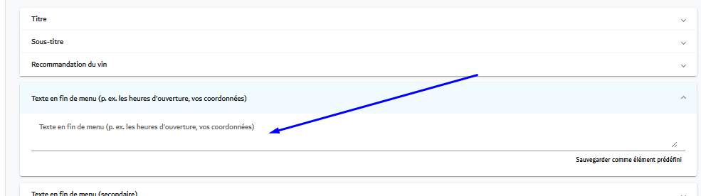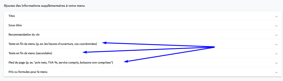 - Texte à la fin du menu (par exemple, heures d'ouverture, coordonnées),