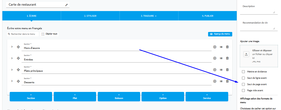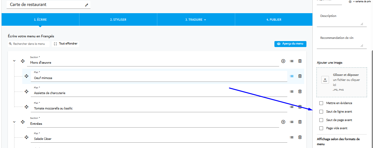 La fonctionnalité "Page vide avant" dans Menutech vous permet d'insérer une page vierge avant l'élément qui a la fonctionnalité activée.